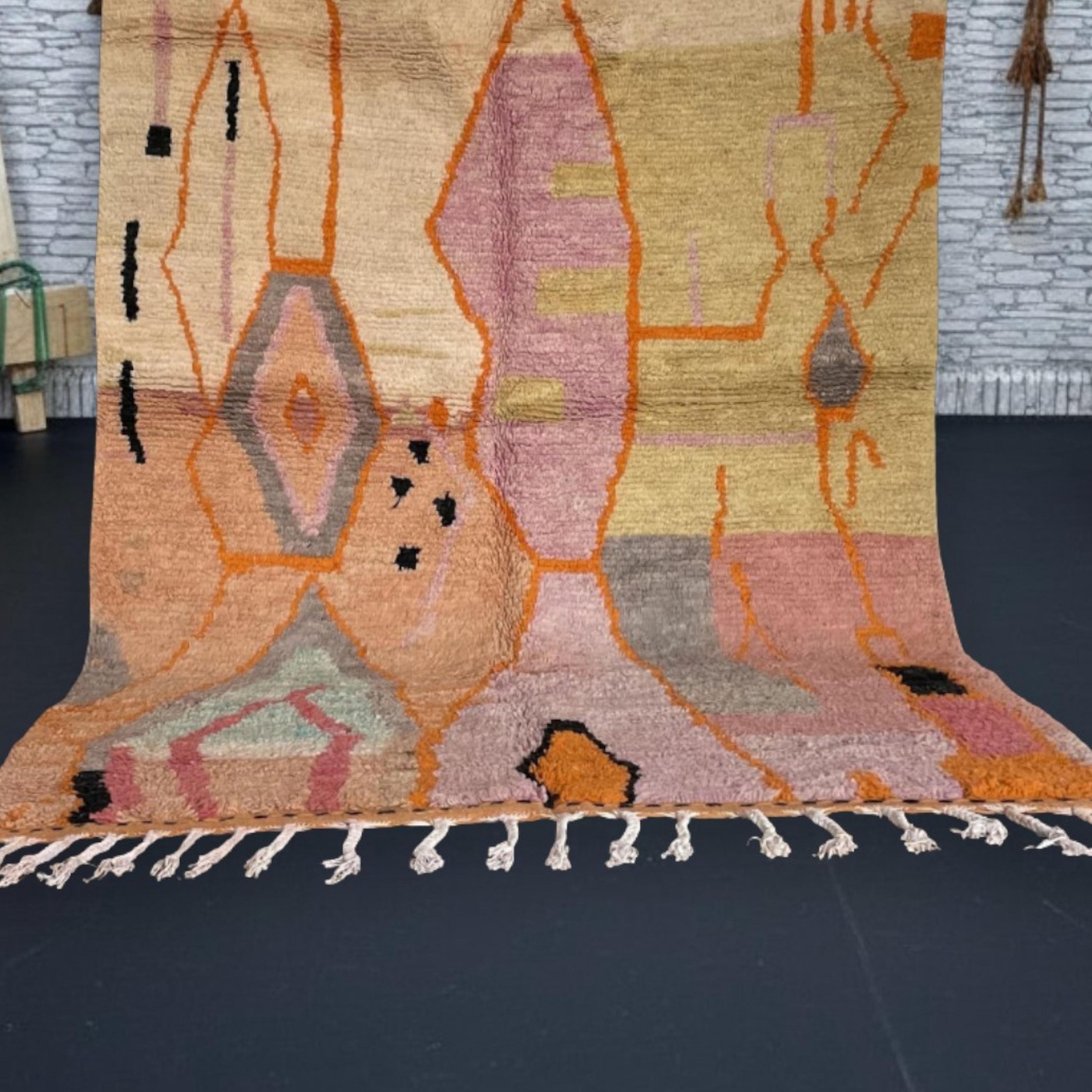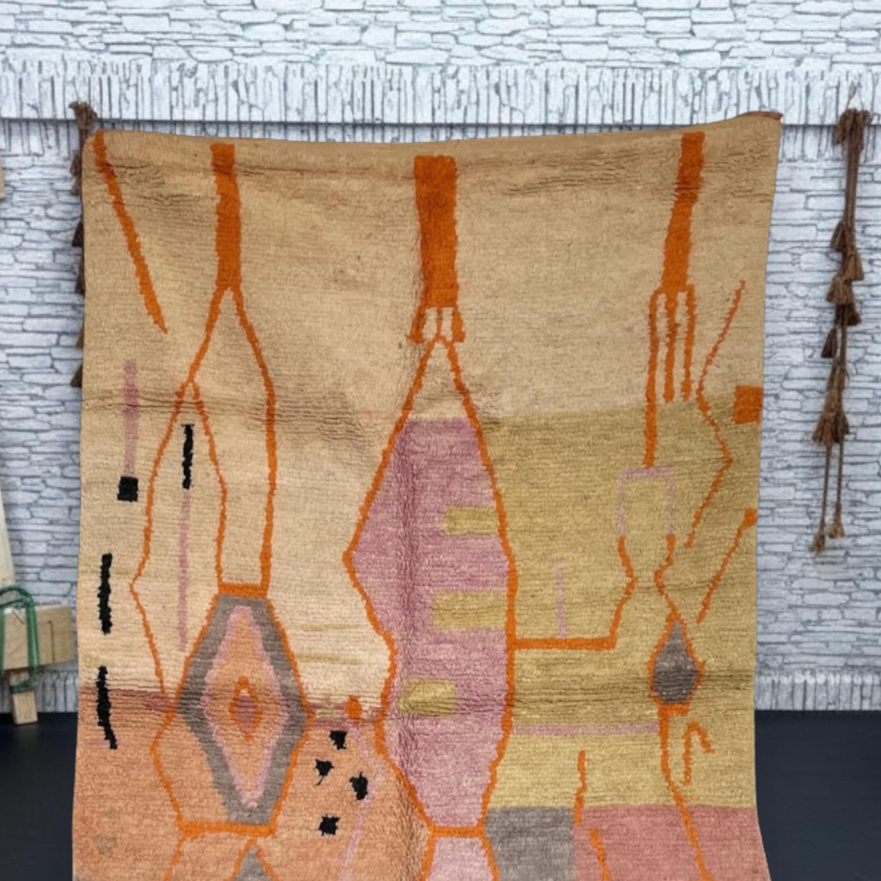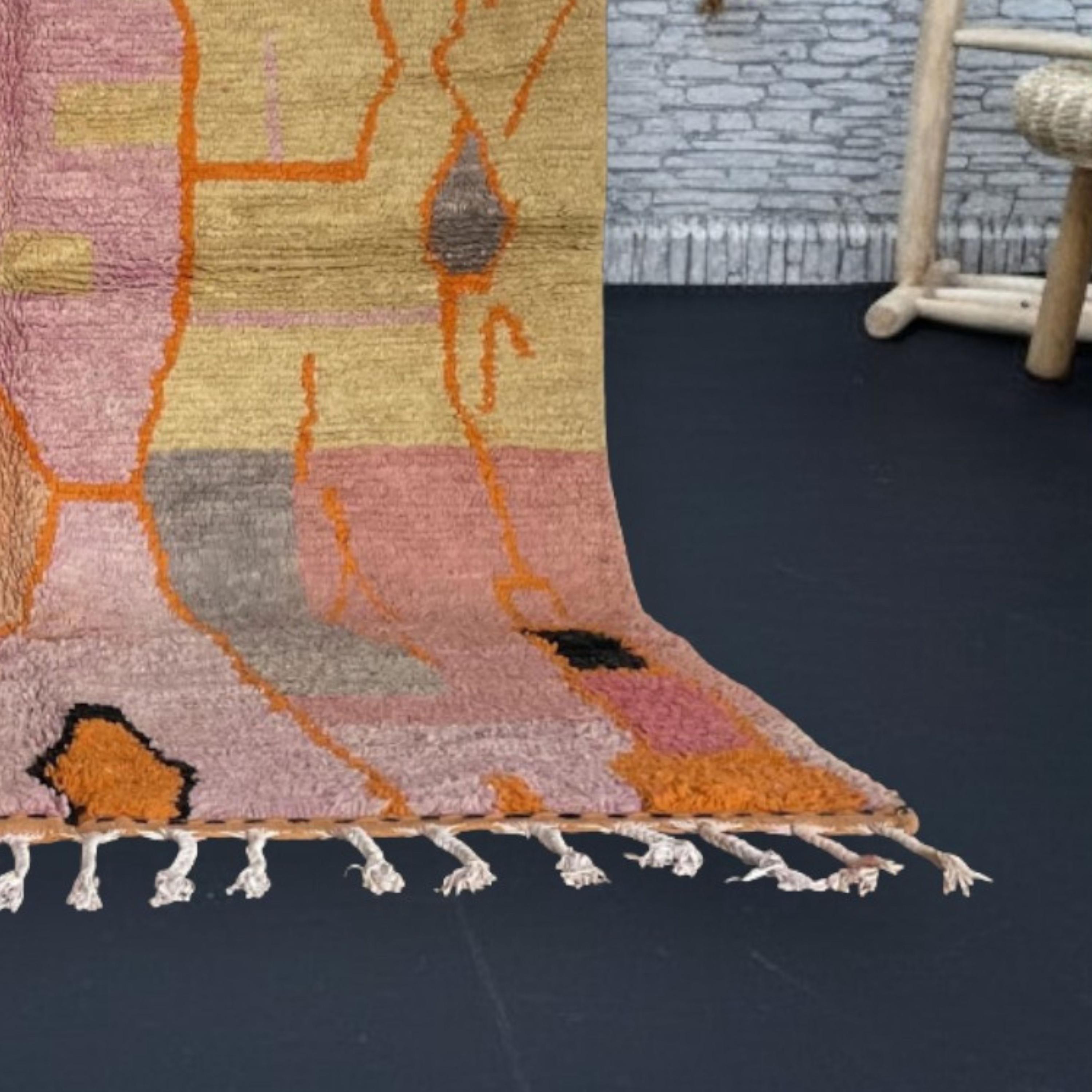Woven by skilled artisans in the Atlas Mountains, this rug combines warm tones of terracotta, mustard, peach, and rose with striking orange and black details, creating a perfect statement piece for your living room, bedroom, or creative space.