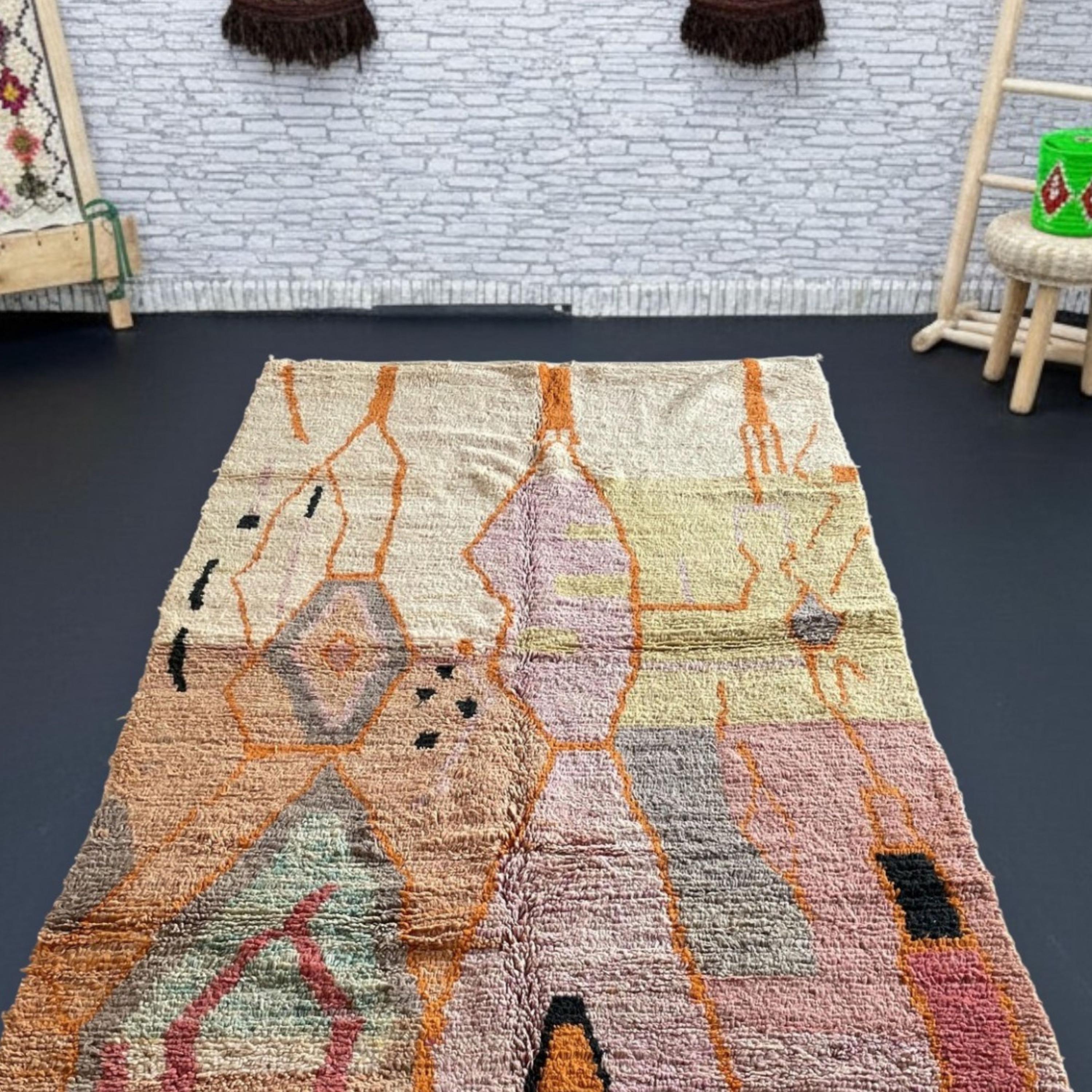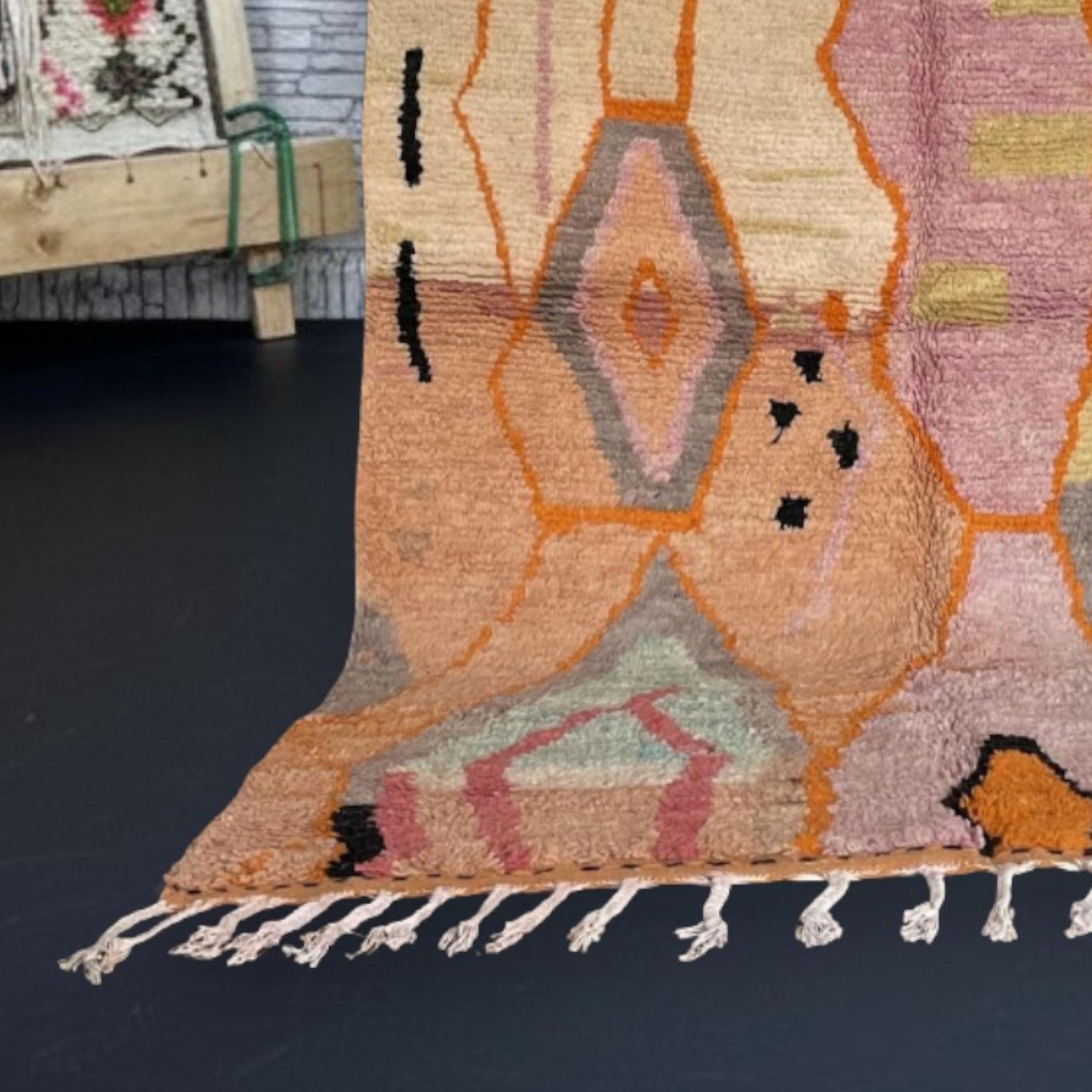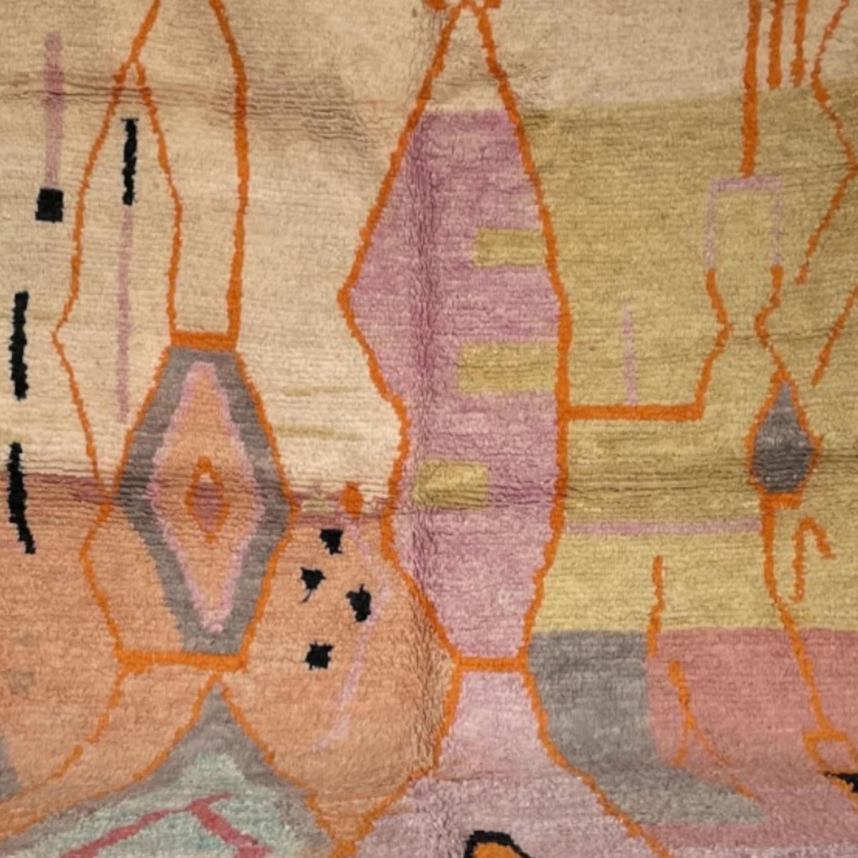 Woven by skilled artisans in the Atlas Mountains, this rug combines warm tones of terracotta, mustard, peach, and rose with striking orange and black details, creating a perfect statement piece for your living room, bedroom, or creative space.