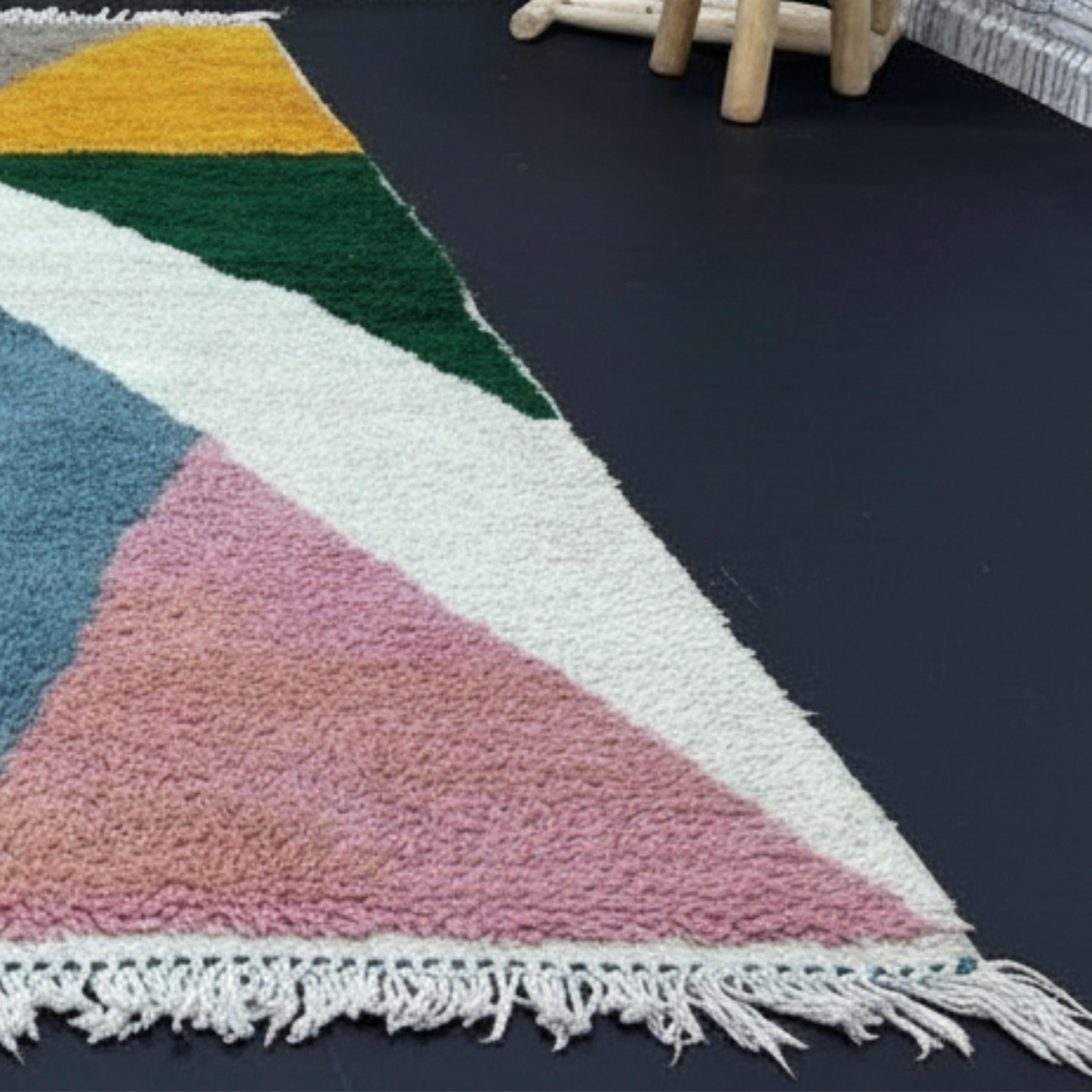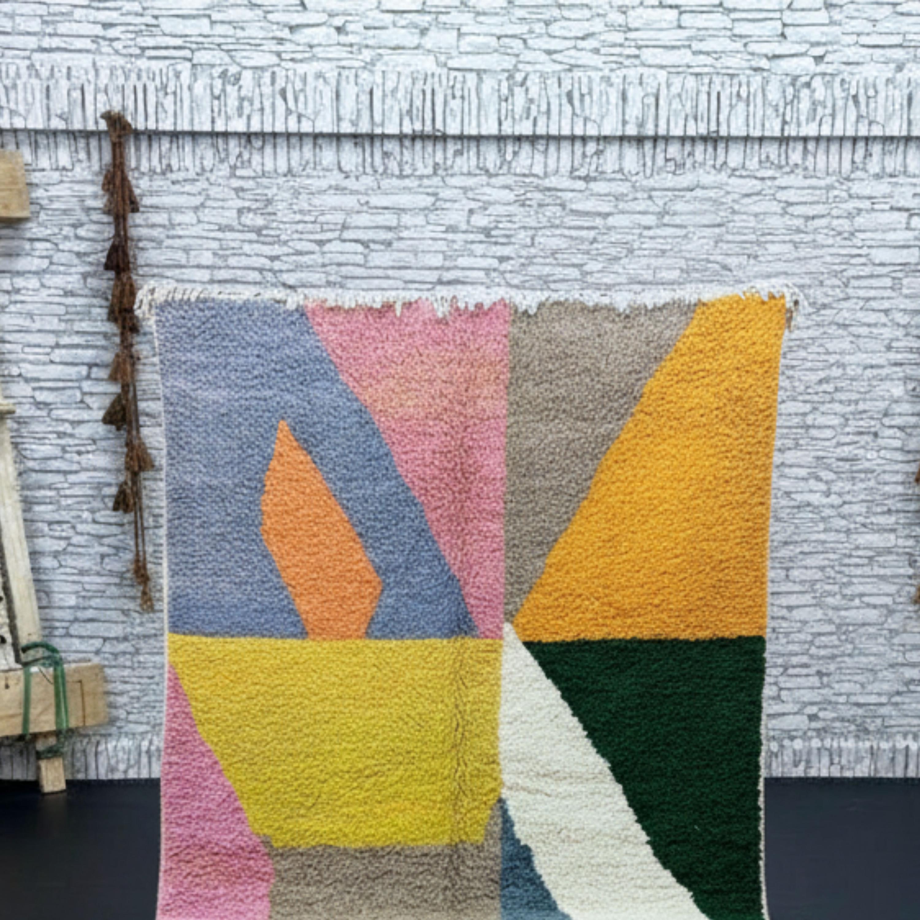 Infuse your home with energy, creativity, and heritage through this Handmade Moroccan Wool Rug, featuring a bold abstract geometric pattern in vibrant tones of mustard yellow, forest green, orange, pink, and soft beige. Each rug is a one-of-a-kind piece — handwoven by skilled Berber artisans using techniques passed down through generations.
