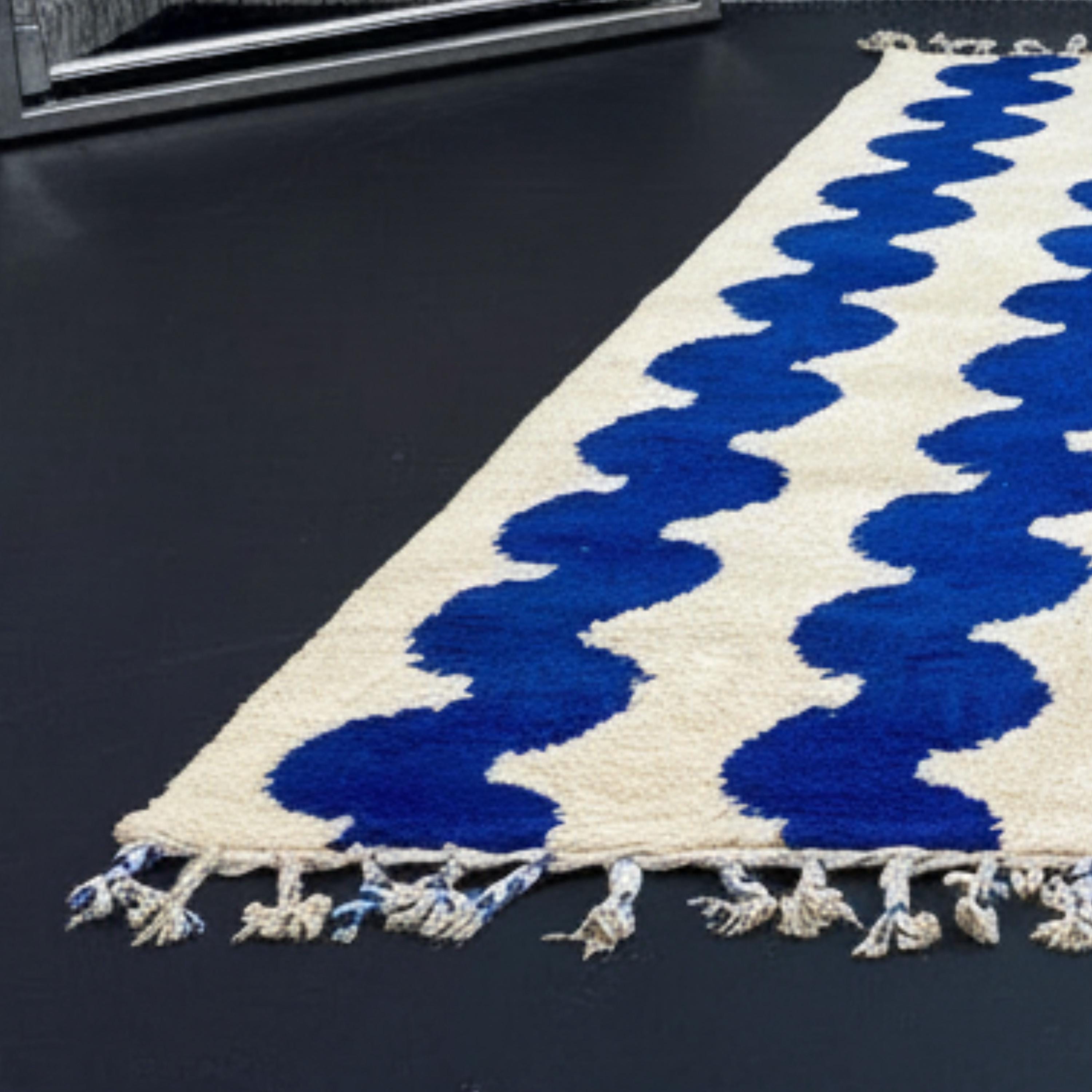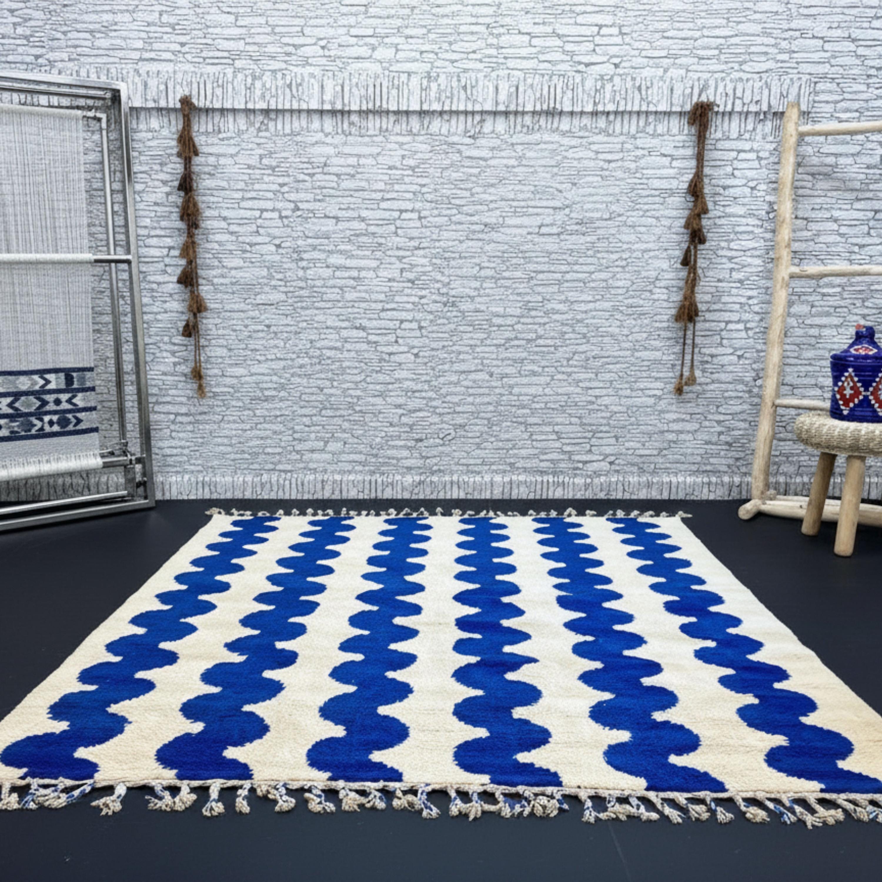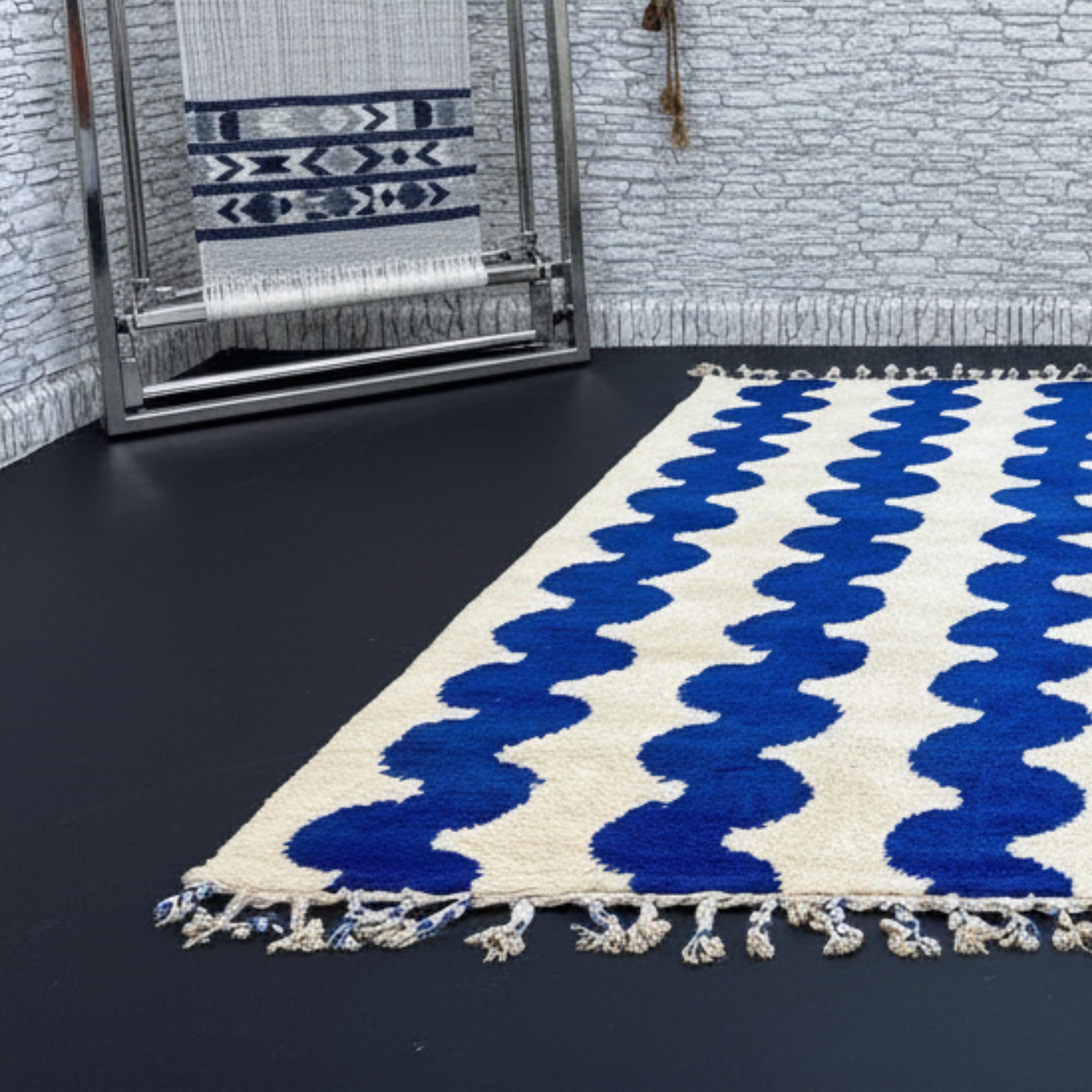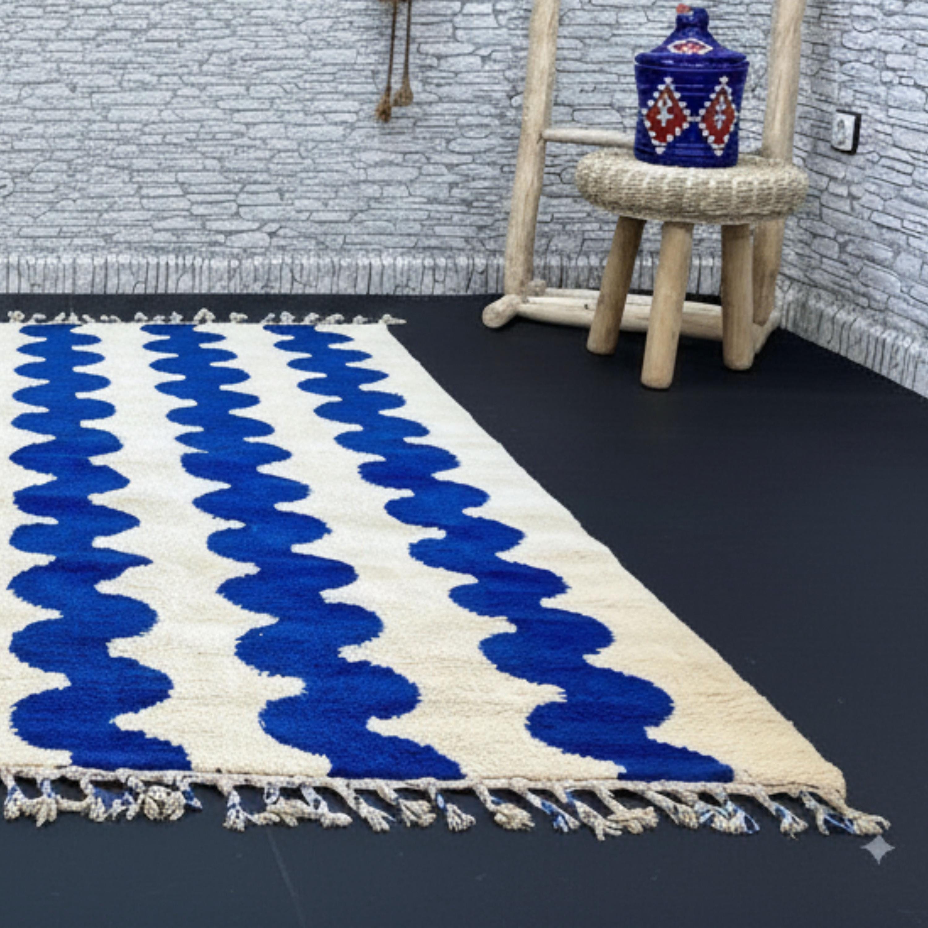 Transform your living space with this Gorgeous Beni Ourain Moroccan Rug, a timeless piece handwoven by skilled Berber artisans in the Atlas Mountains. Its minimalist cream background and bold blue wavy line pattern create a stunning blend of tradition and modern design — perfect for elevating any interior.