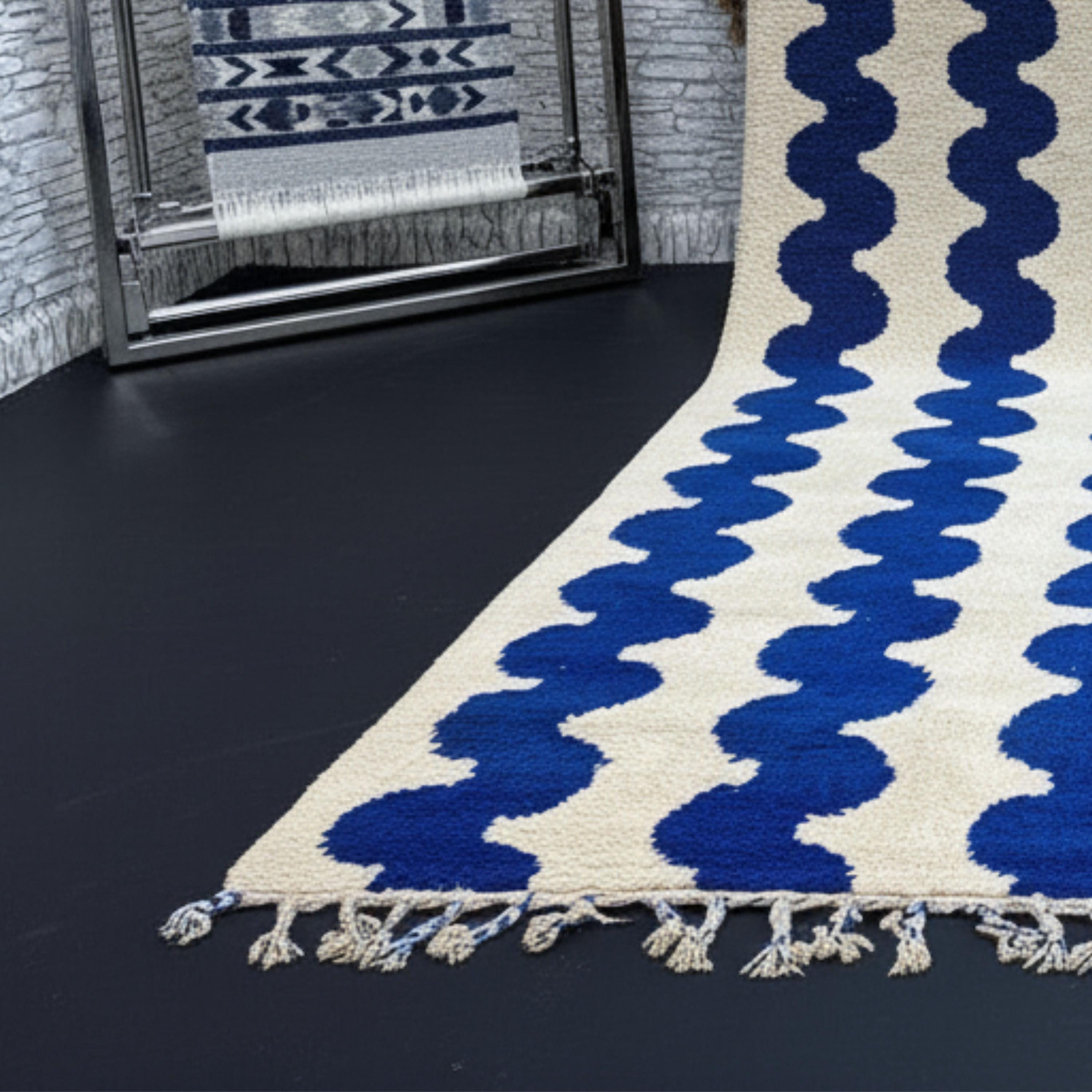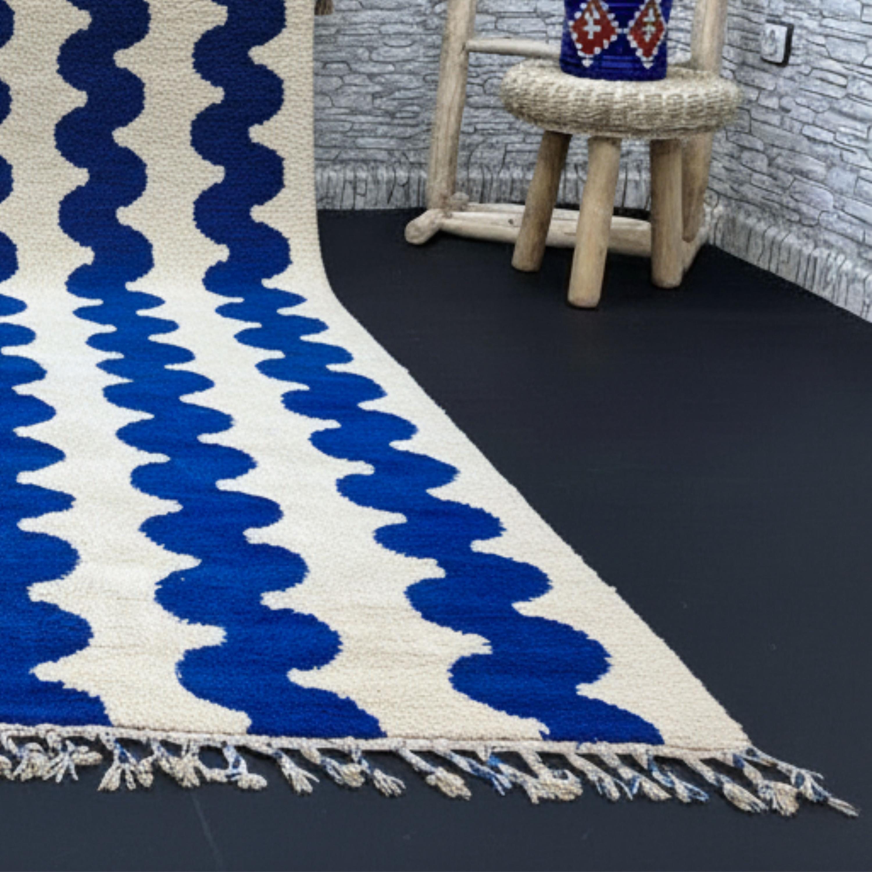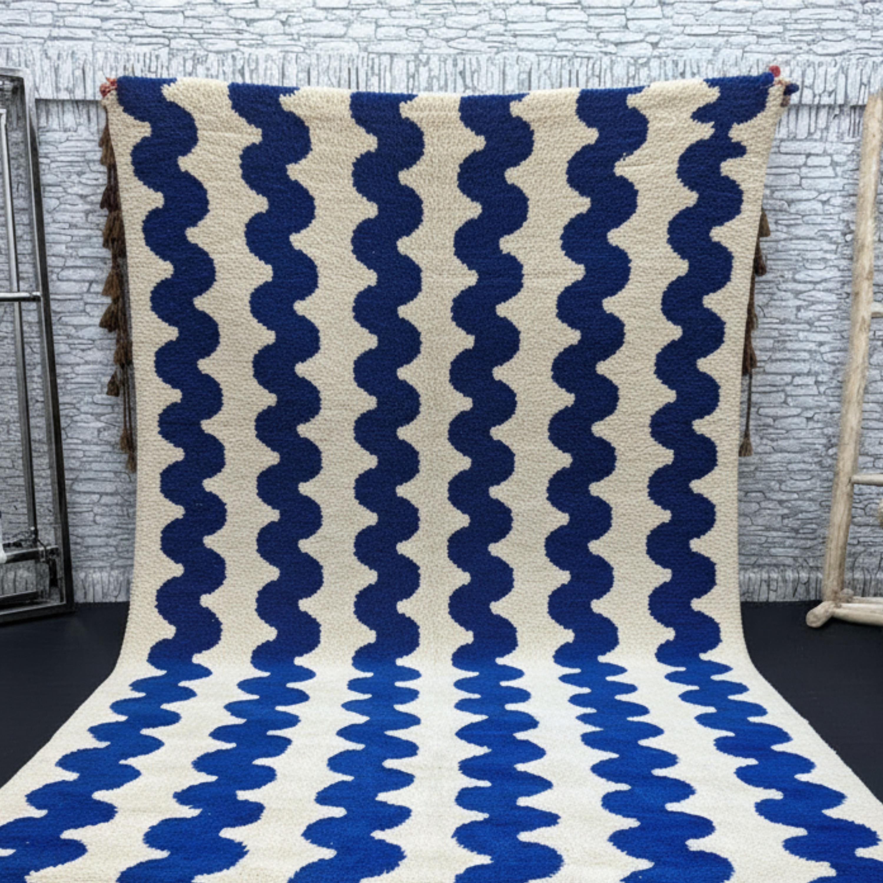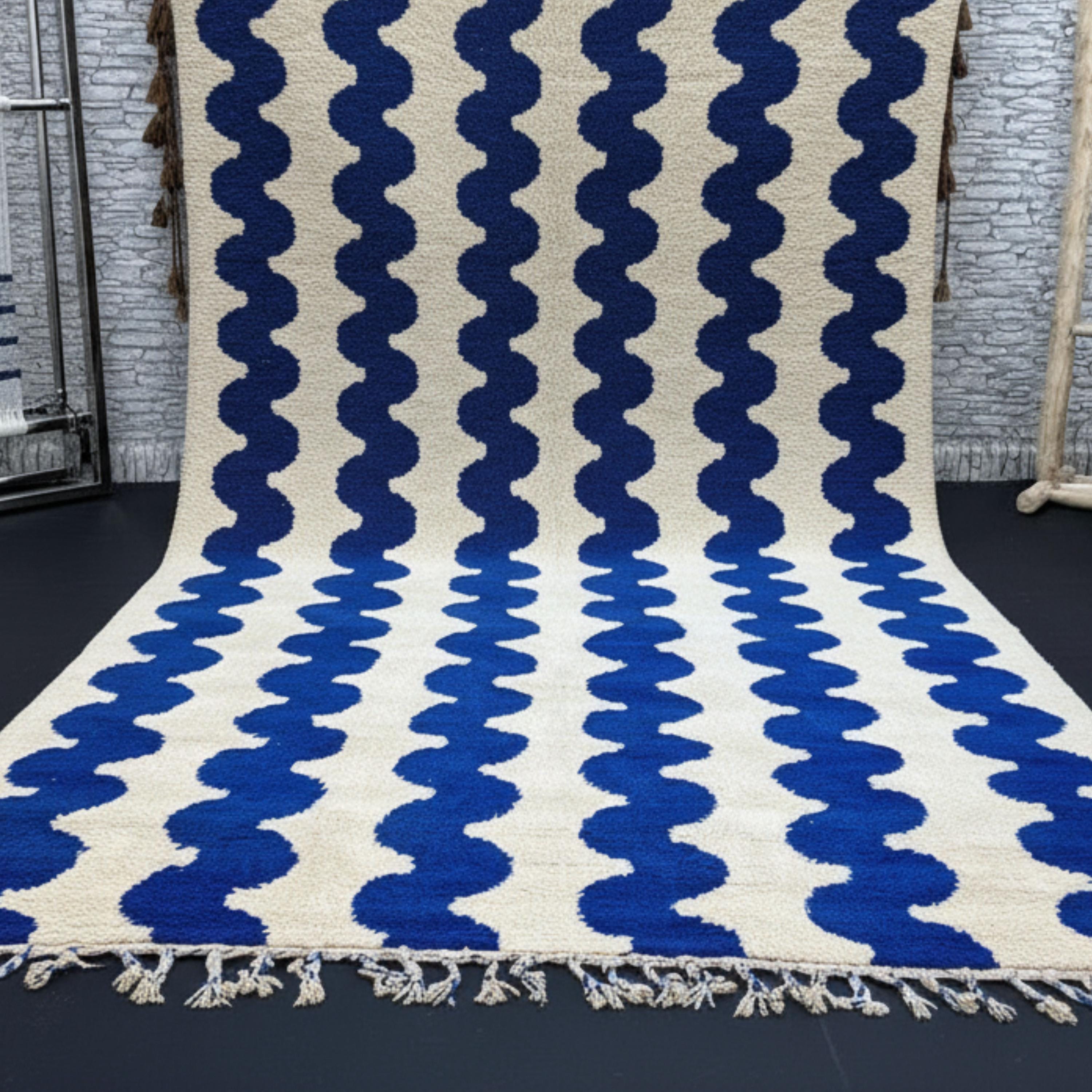 Transform your living space with this Gorgeous Beni Ourain Moroccan Rug, a timeless piece handwoven by skilled Berber artisans in the Atlas Mountains. Its minimalist cream background and bold blue wavy line pattern create a stunning blend of tradition and modern design — perfect for elevating any interior.
