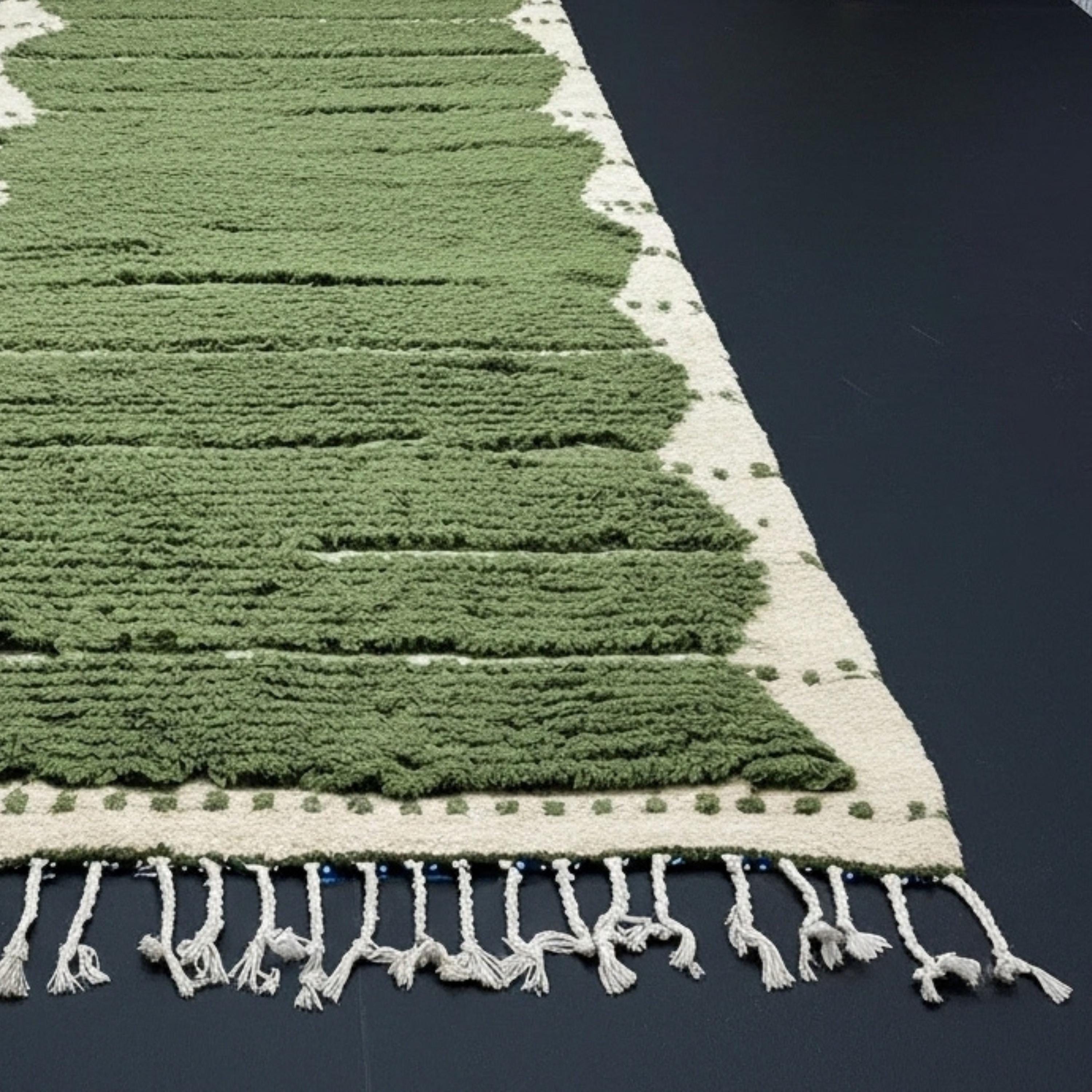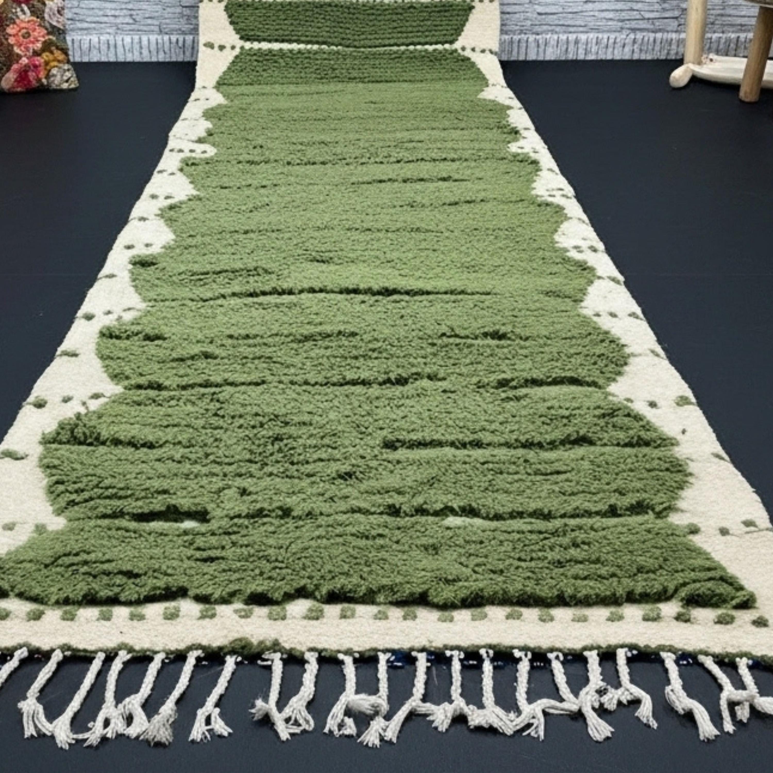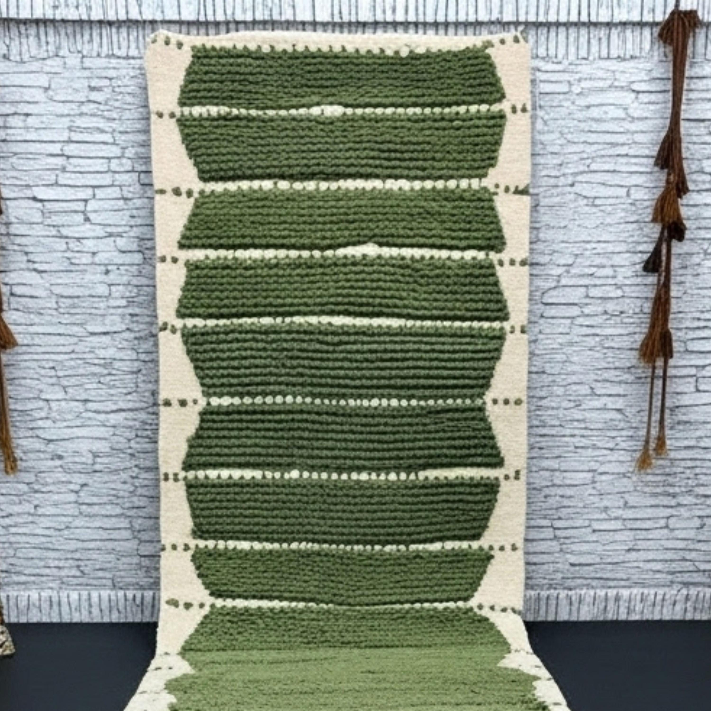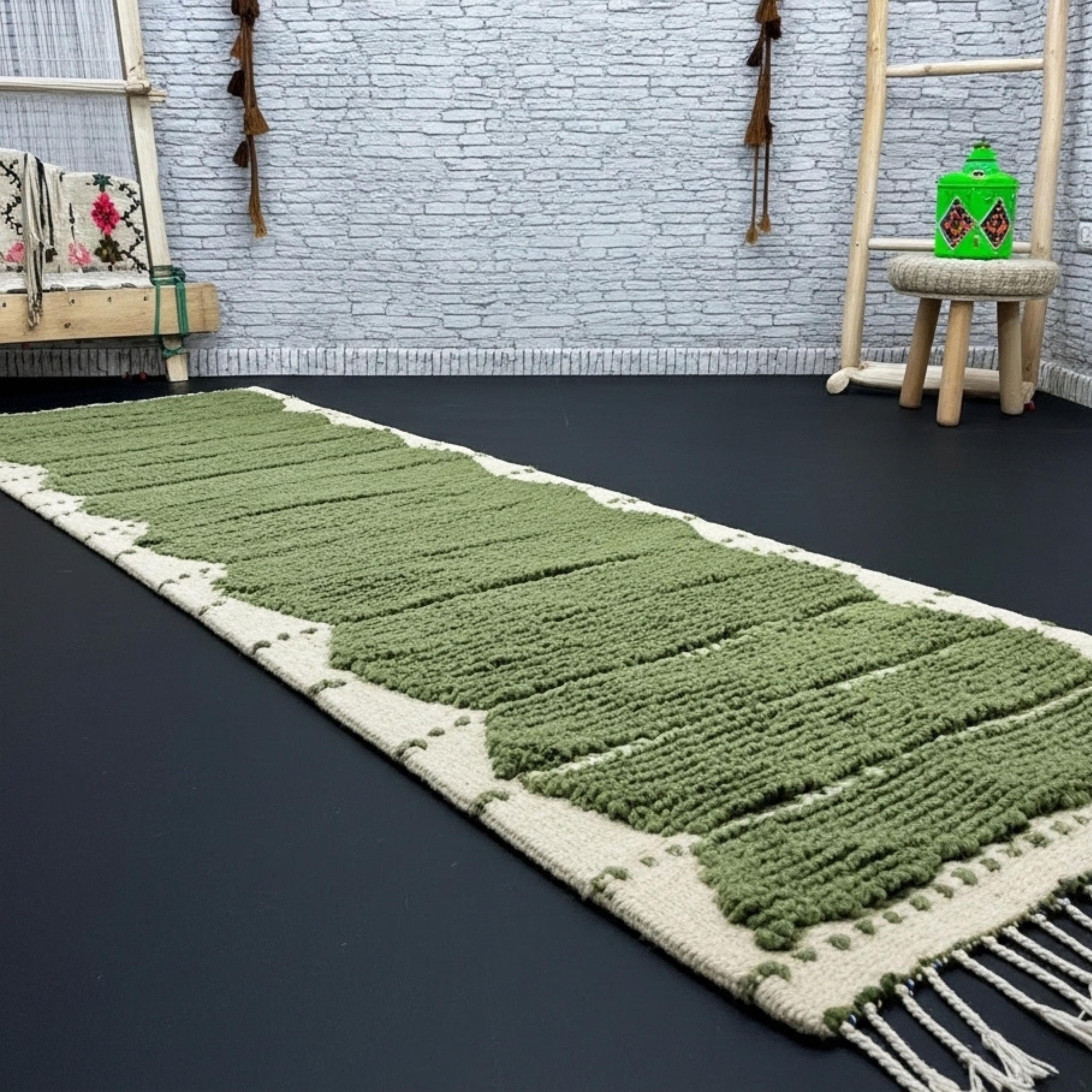 Enhance your home’s natural beauty with this handmade green Moroccan wool runner rug, crafted by skilled Berber artisans. The simple yet elegant minimalist design combines a soft cream base with rich green patterns, making it the perfect statement piece for your hallway, bedroom, or living space 🌿. Its organic tones bring calm and warmth to any interior while maintaining an authentic Moroccan charm.