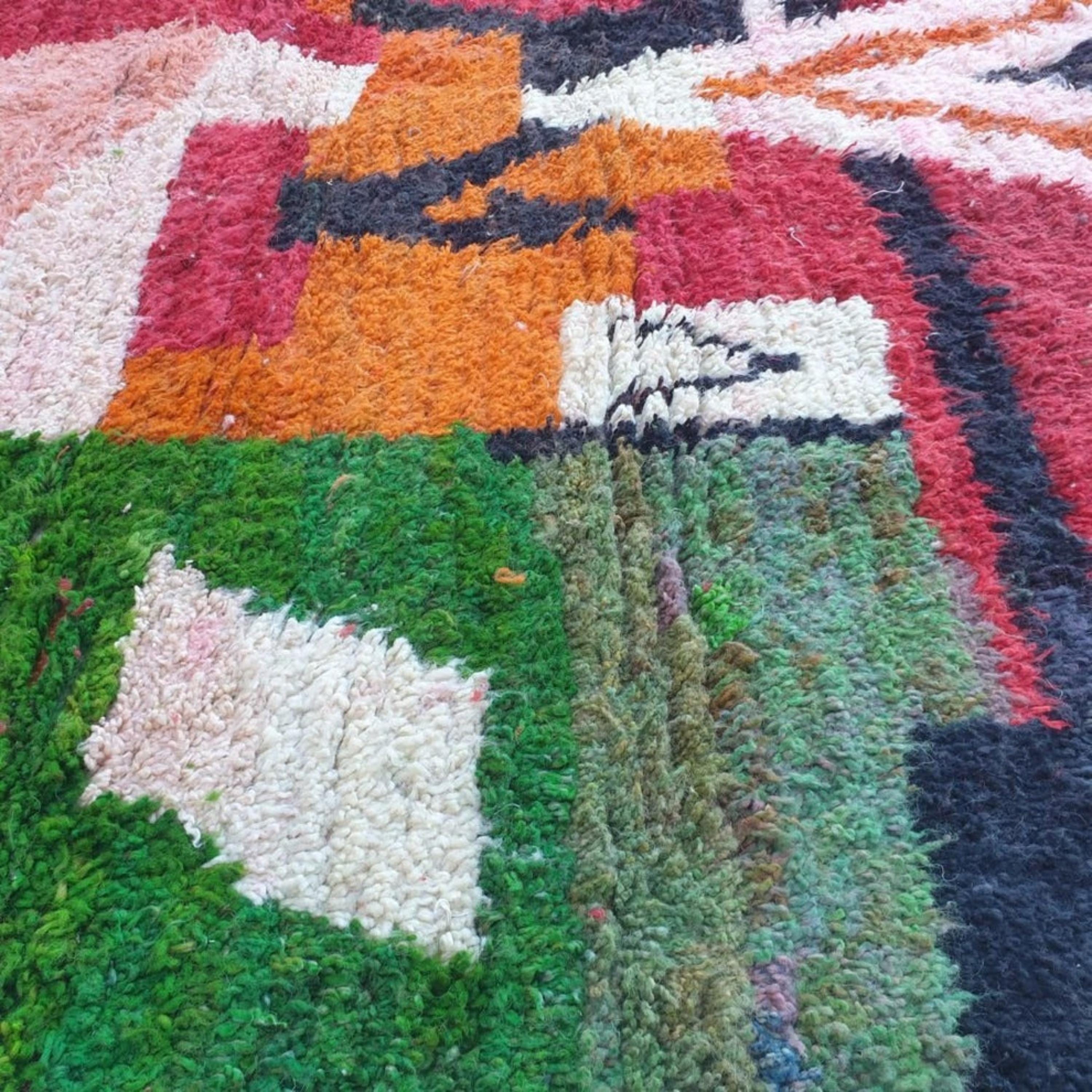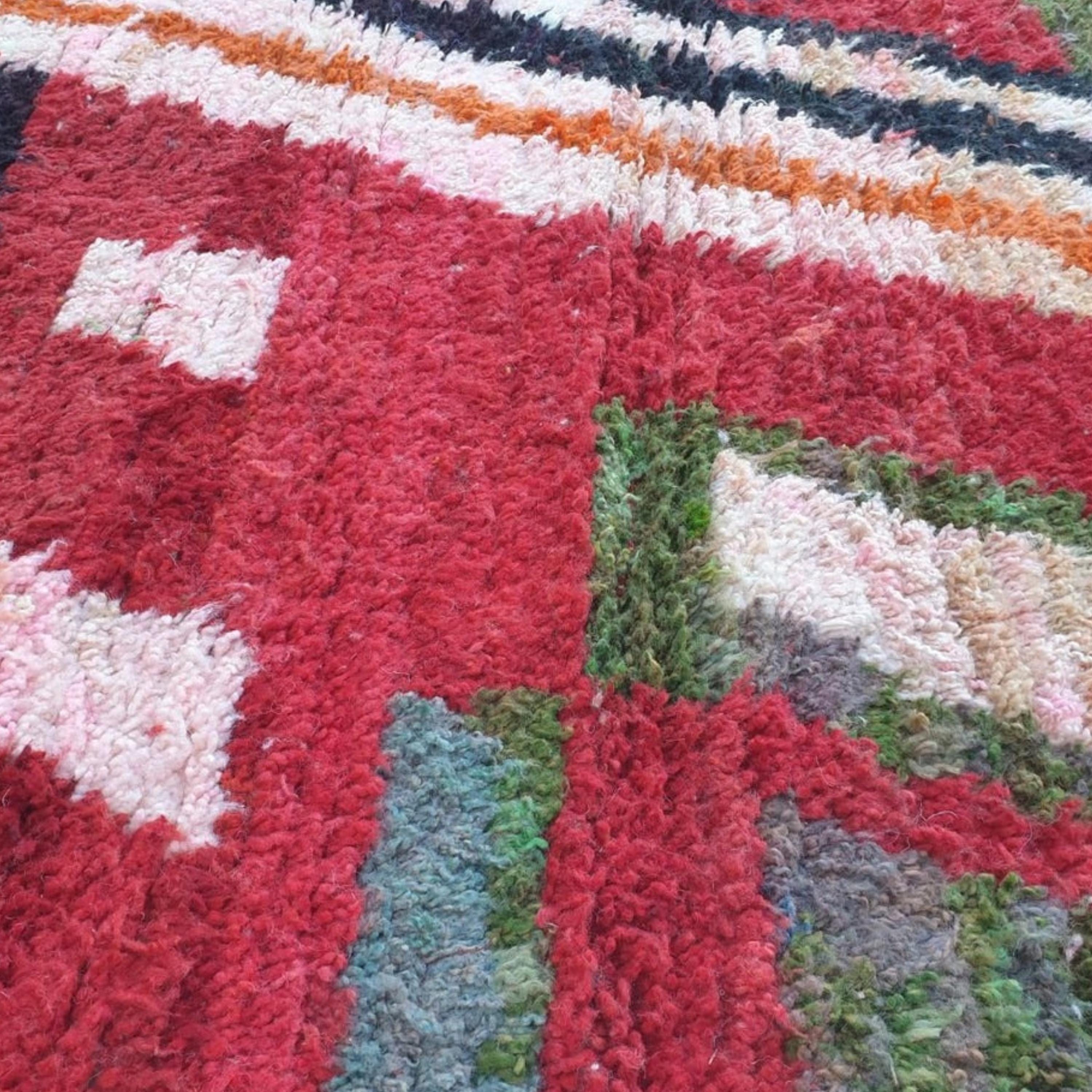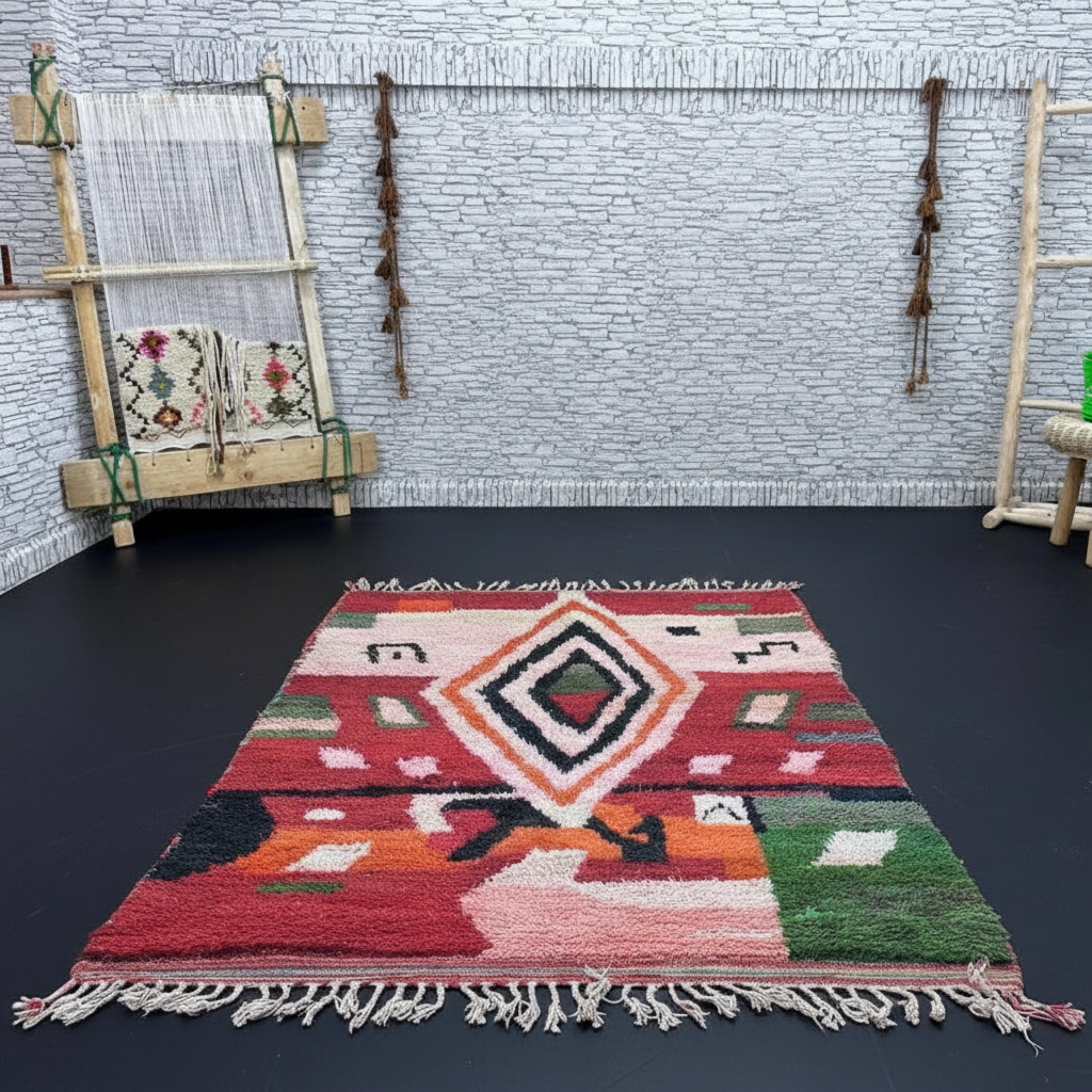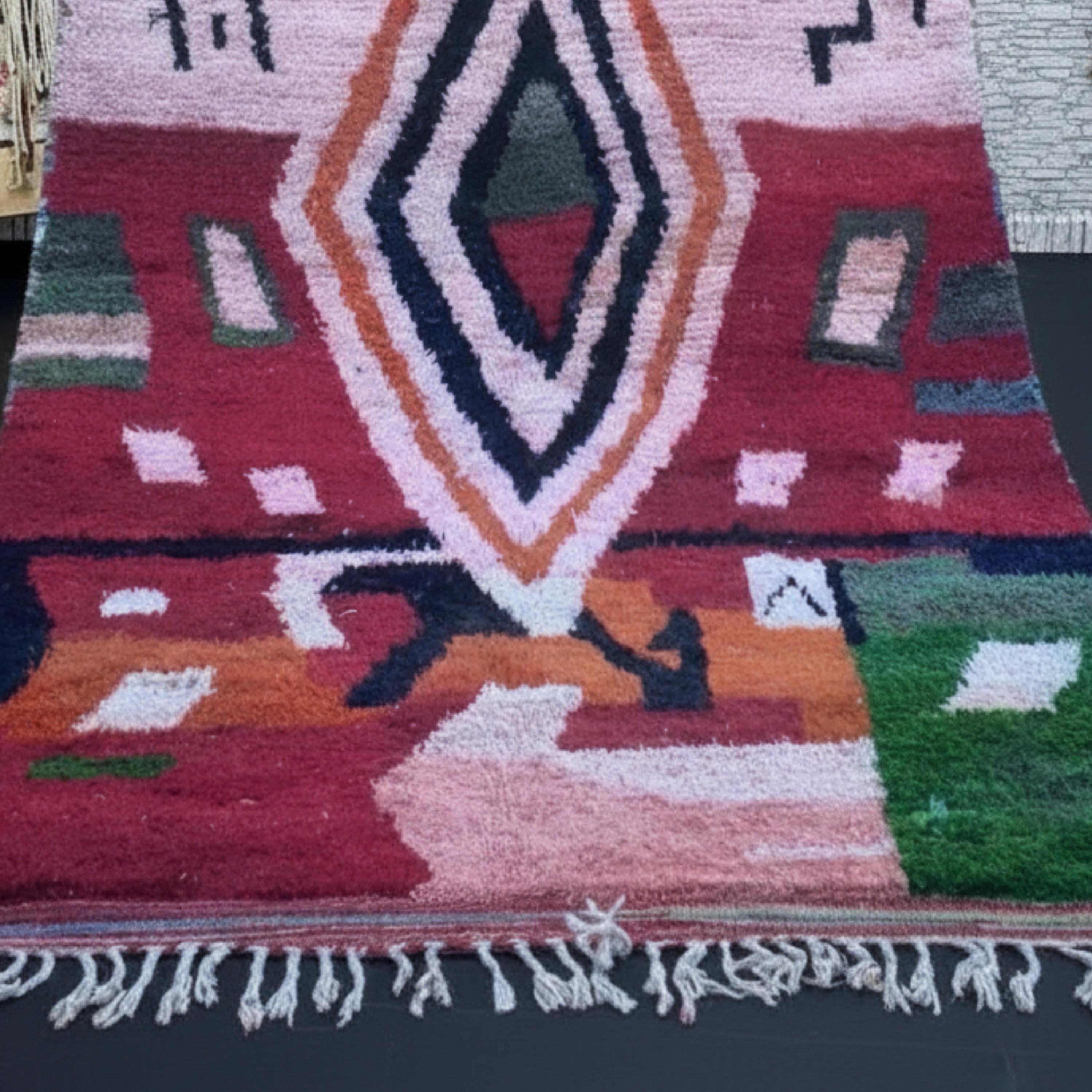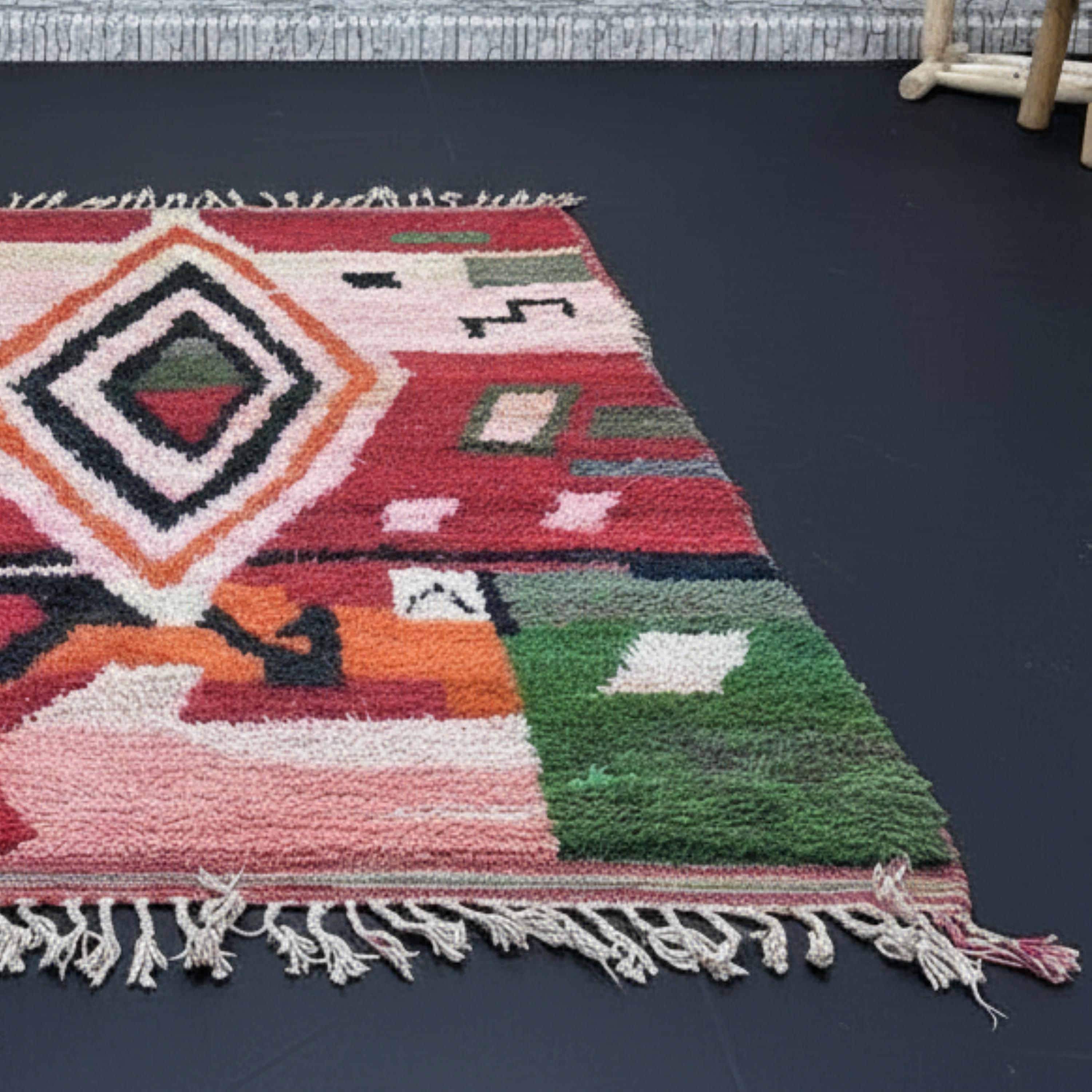 Transform your living space with a burst of color, culture, and craftsmanship. This Multicolored Moroccan Boujaad Rug is a handmade treasure woven by Berber women in the Atlas Mountains of Morocco — a true piece of art beneath your feet.