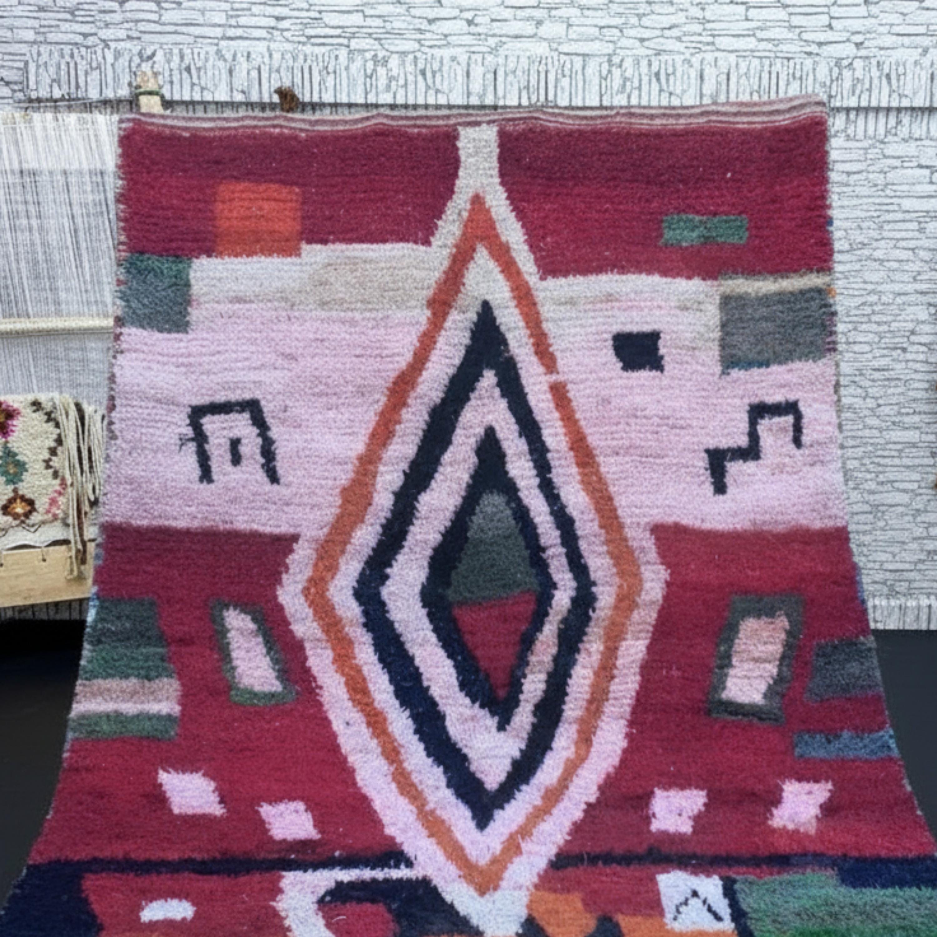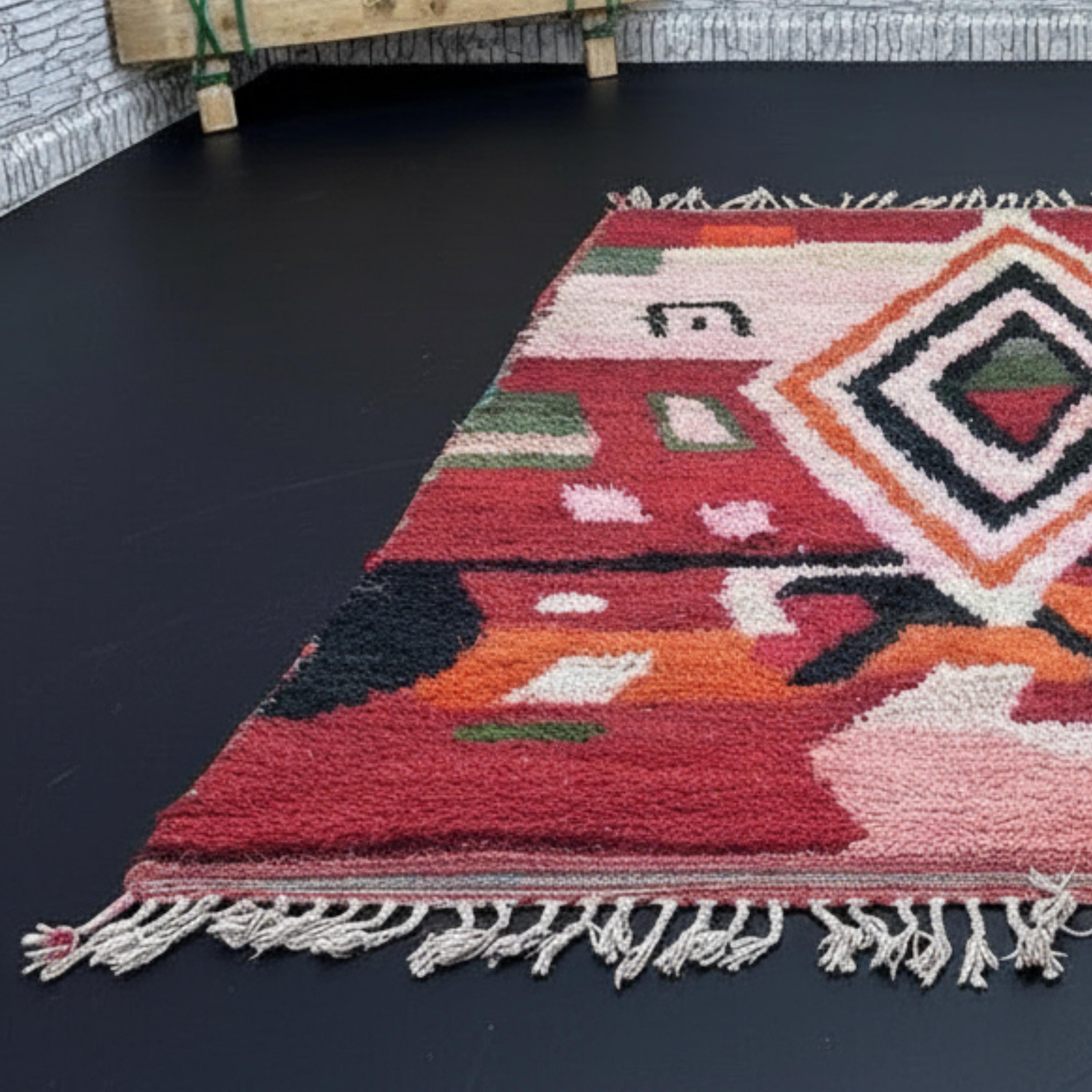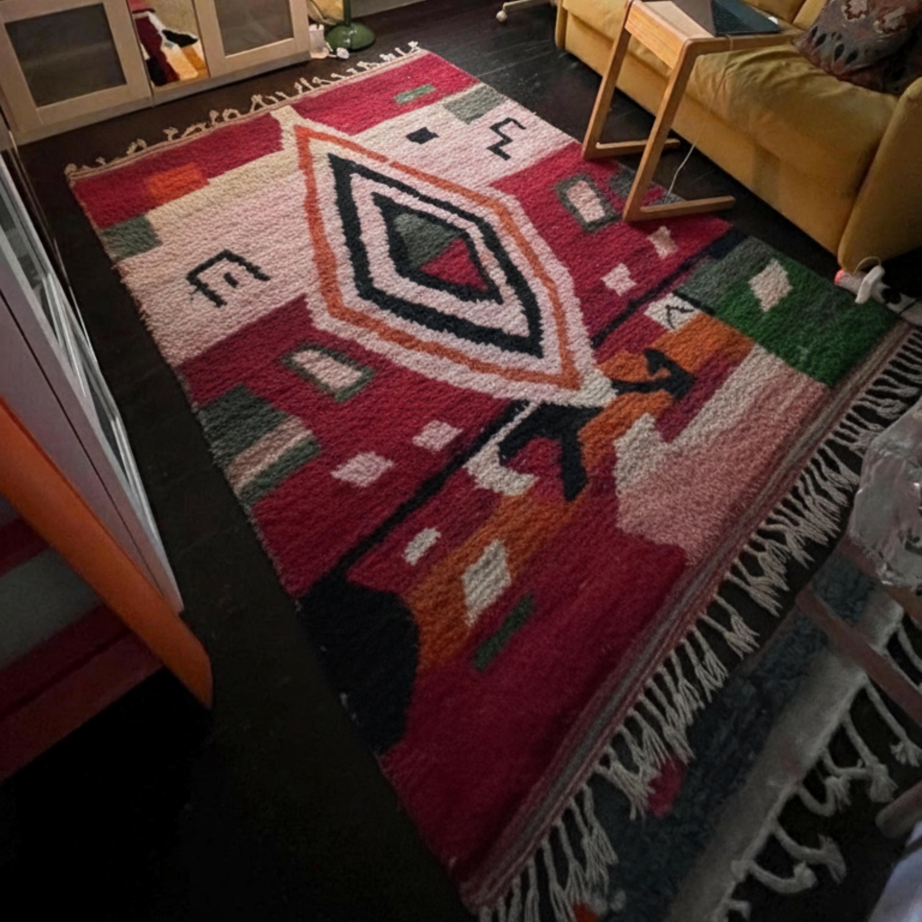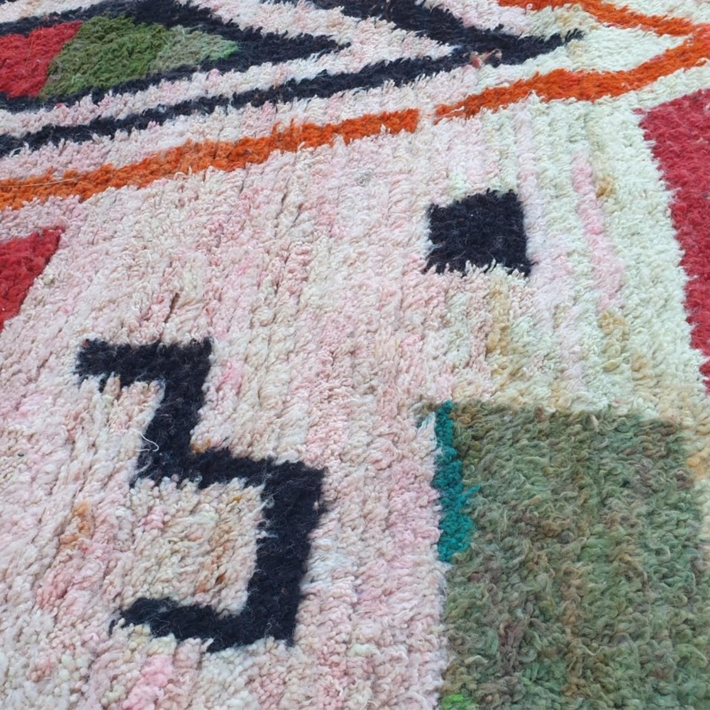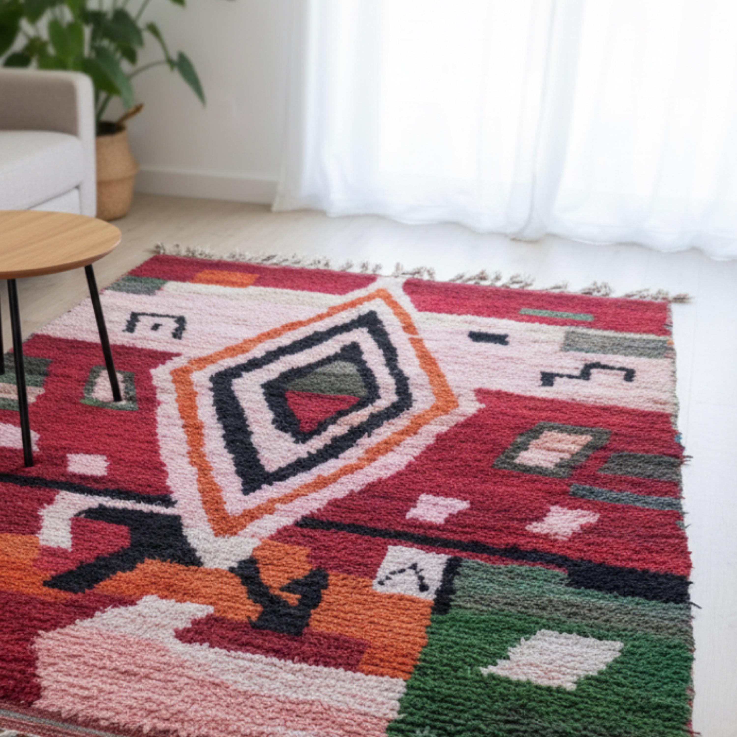 Transform your living space with a burst of color, culture, and craftsmanship. This Multicolored Moroccan Boujaad Rug is a handmade treasure woven by Berber women in the Atlas Mountains of Morocco — a true piece of art beneath your feet.
