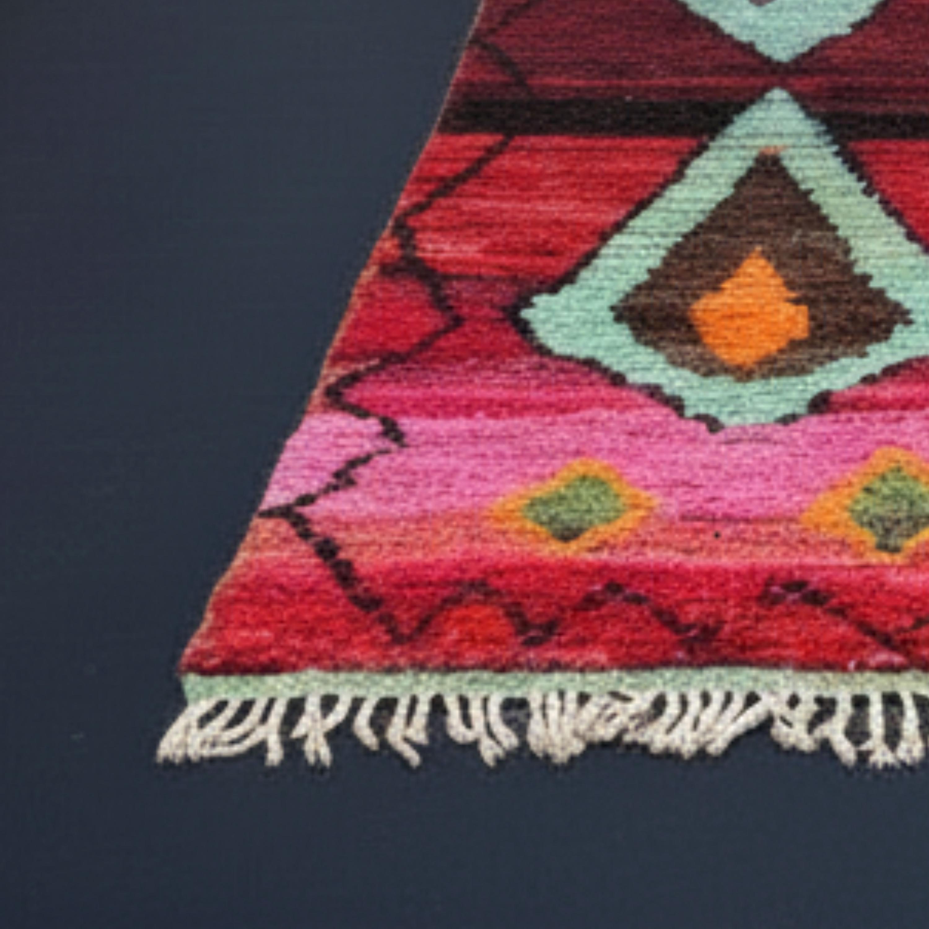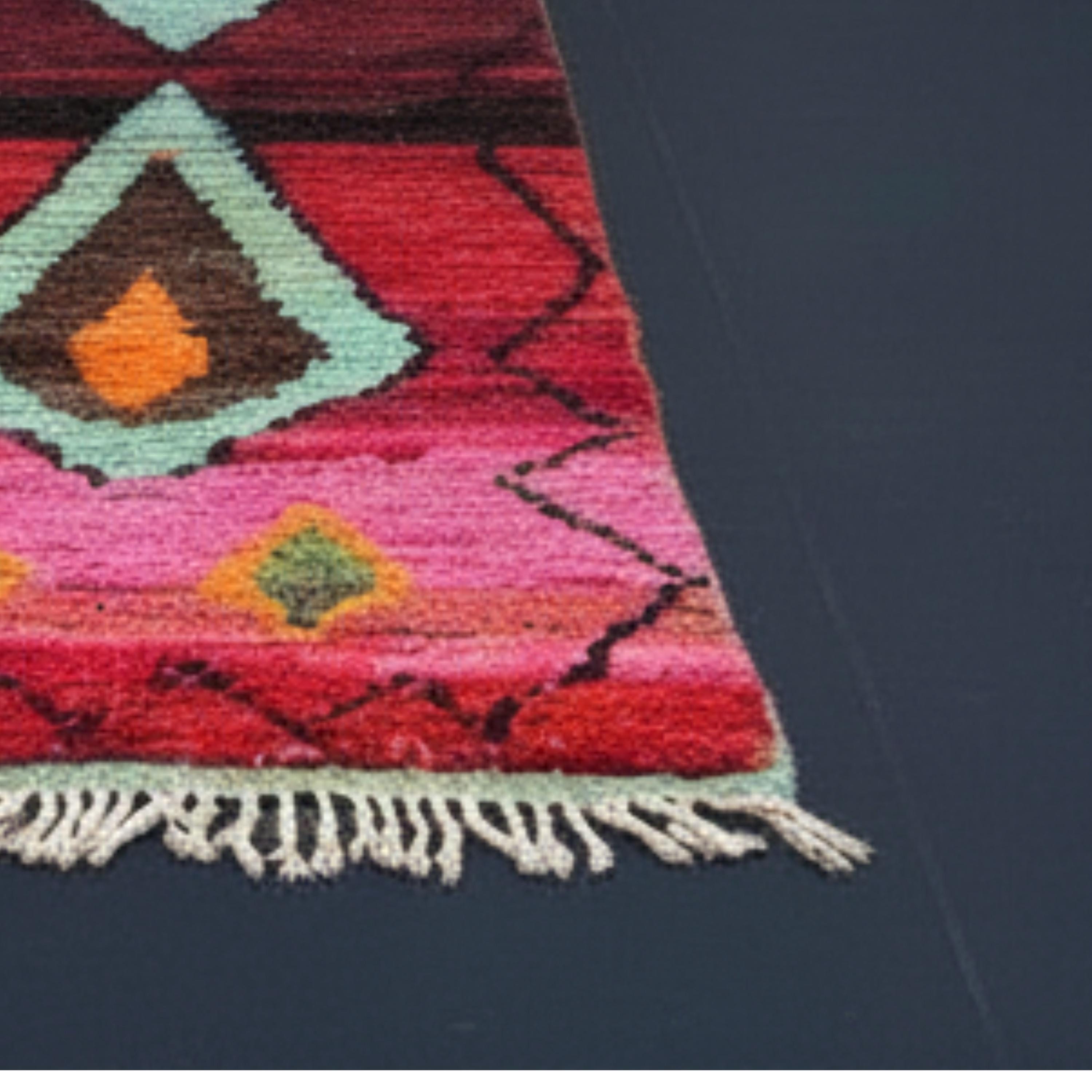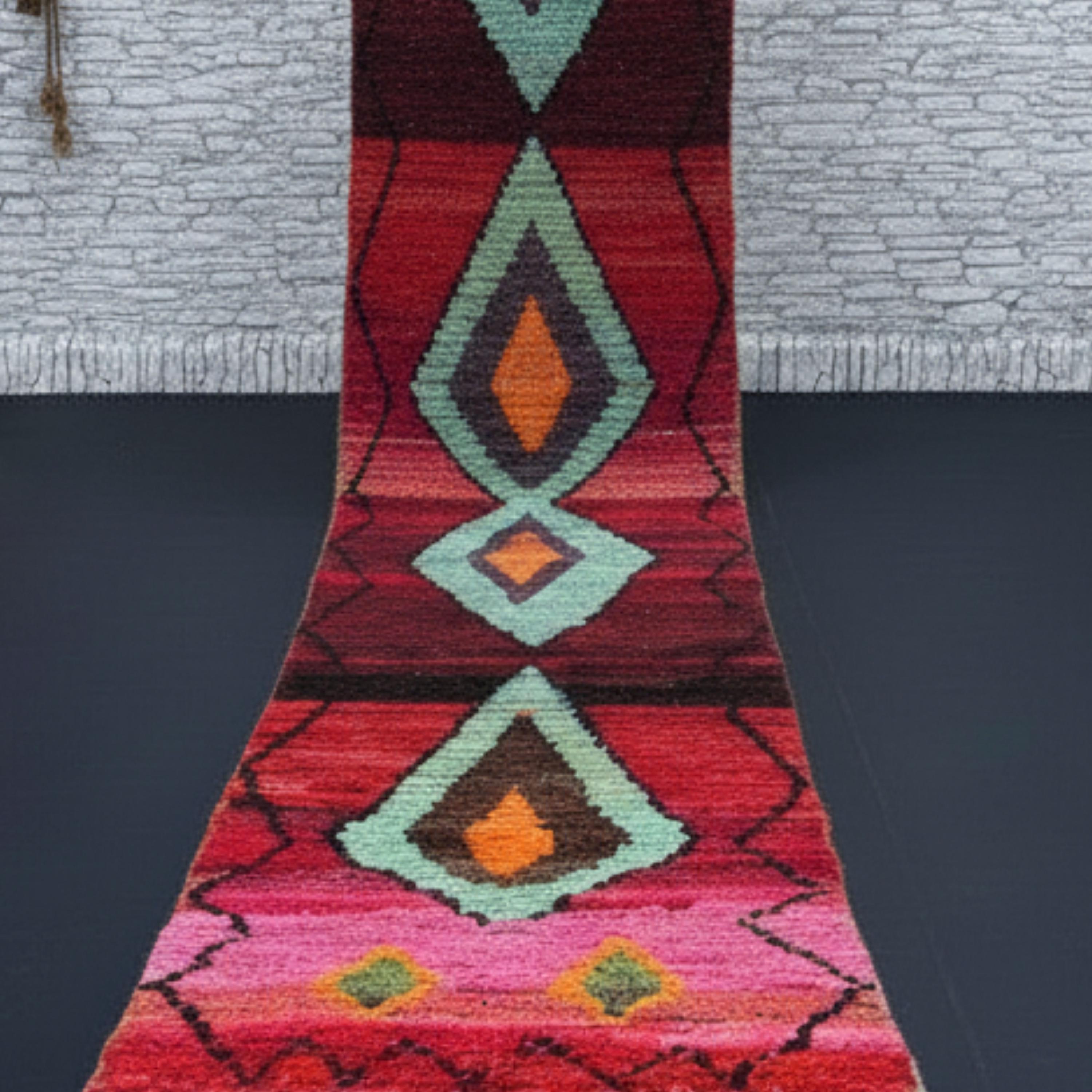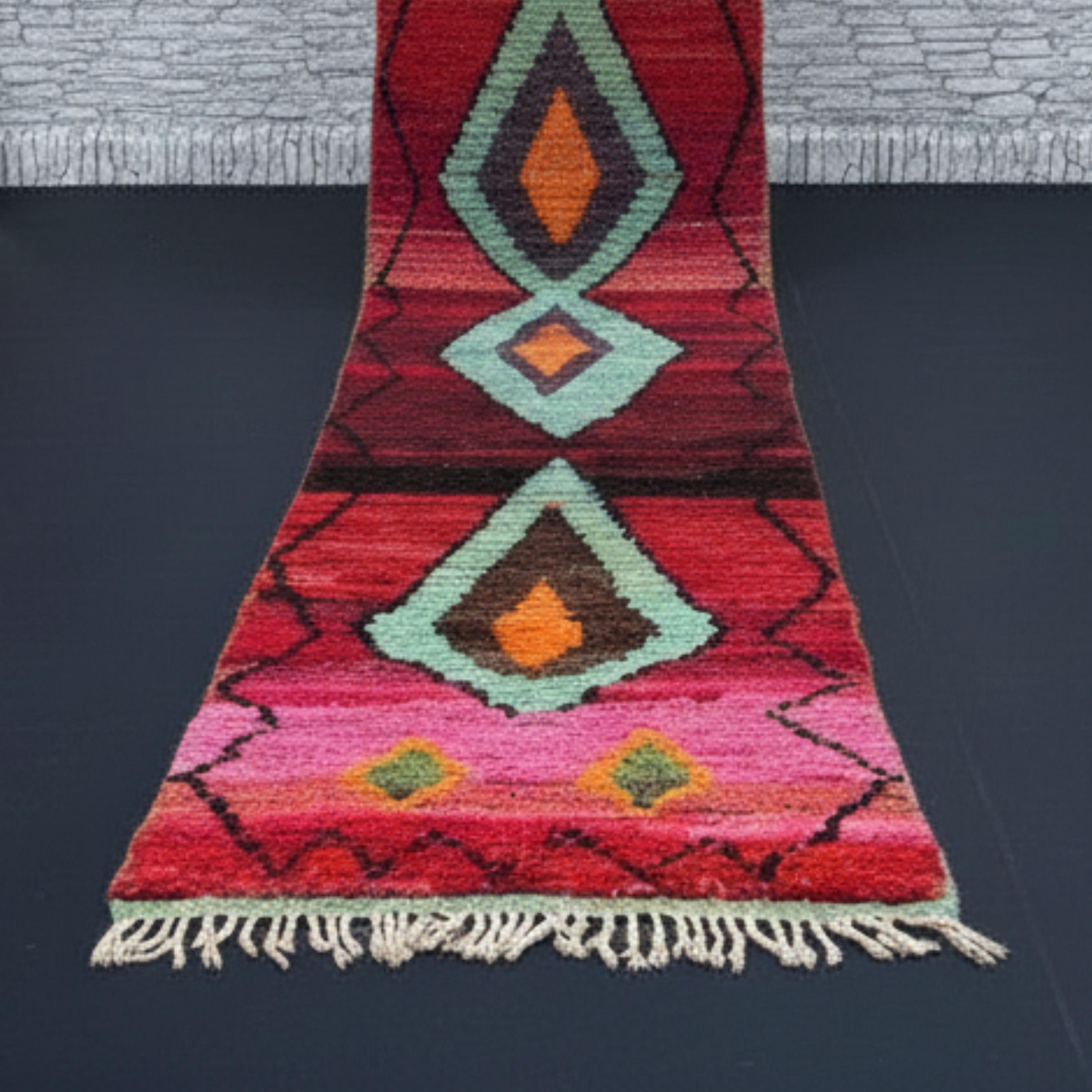 Bring authentic Moroccan charm to your home with this handwoven Berber runner rug, crafted by skilled artisans from the Atlas Mountains. Each piece tells a story of tradition and craftsmanship, blending vibrant pink, orange, green, and earthy tones in geometric diamond patterns that radiate warmth and style.